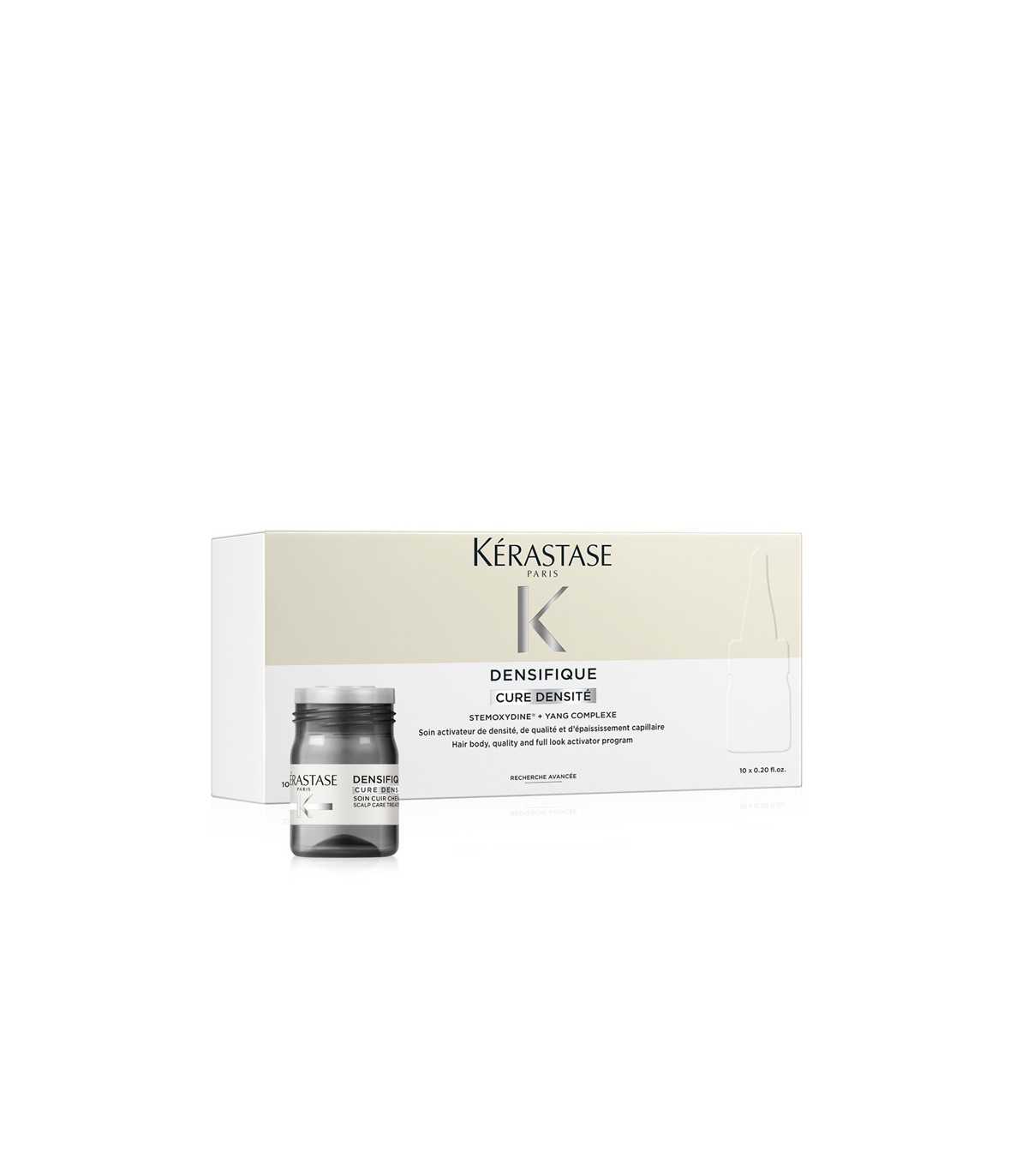 Kérastase Densifique Curas Femme es un tratamiento intensivo de densidad capilar, disponible en estuches de 10 o 42 ampollas de 6 ml. Su fórmula con el complejo activo Stemoxydine ayuda a despertar los folículos pilosos en reposo, mejorando la densidad y la calidad del nuevo cabello. Recomendado para mujeres que notan una disminución de la cantidad o del volumen del cabello.