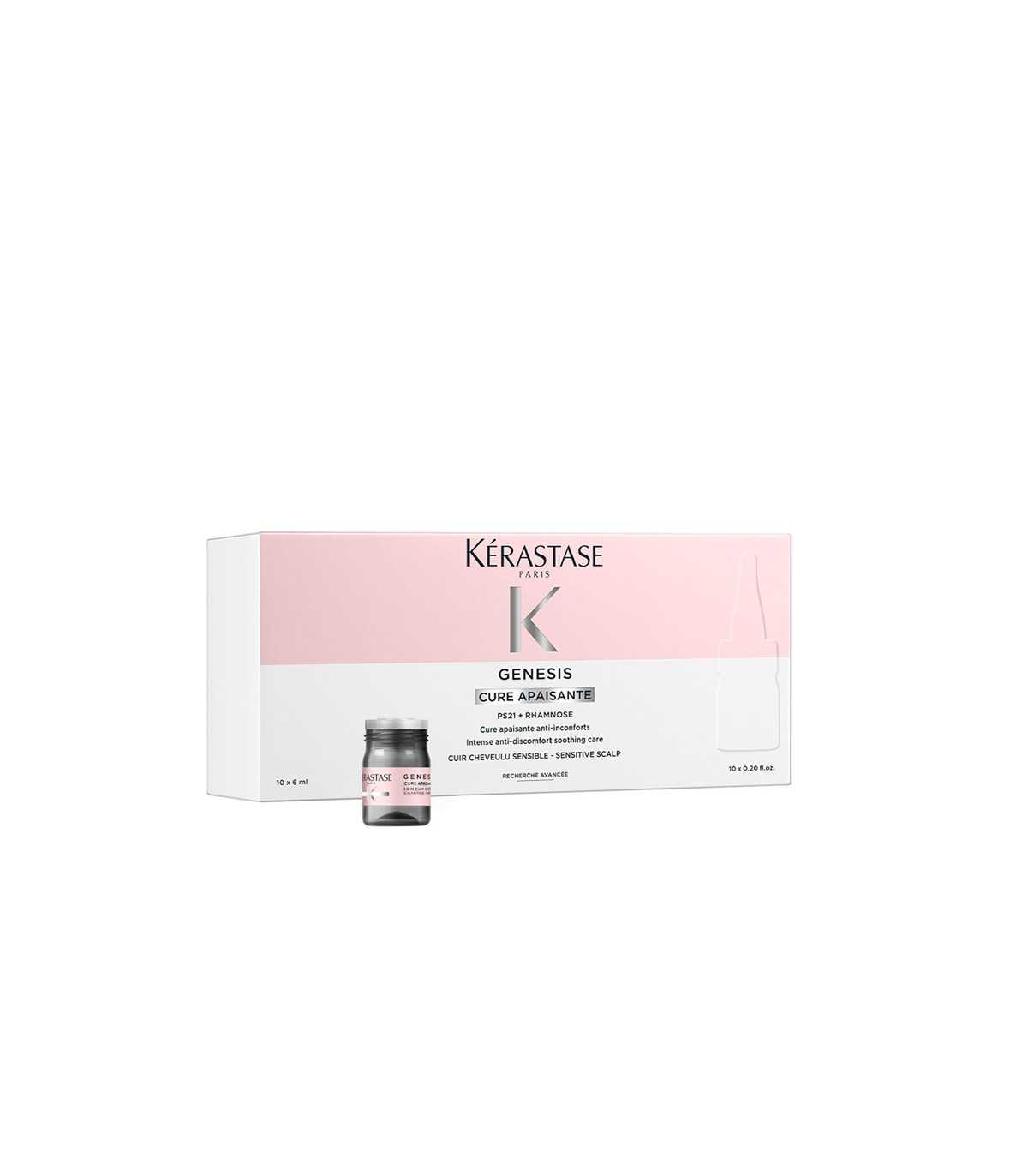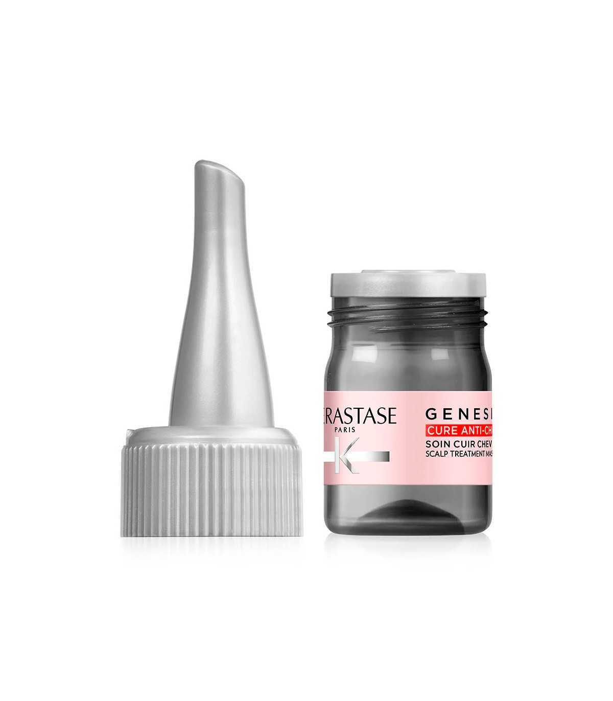 Kérastase Genesis Cure Anti-Chute es un tratamiento intensivo contra la caída del cabello. Su fórmula con Aminexil, Madecassoside, extracto de Moringa y Carnosina fortalece las raíces, mejora la salud del cuero cabelludo y hace que el cabello sea más denso, fuerte y resistente a la caída. No requiere aclarado. El tratamiento está disponible en una cura de mantenimiento (caja de 10 ampollas) y en una cura intensiva (caja de 42 ampollas).