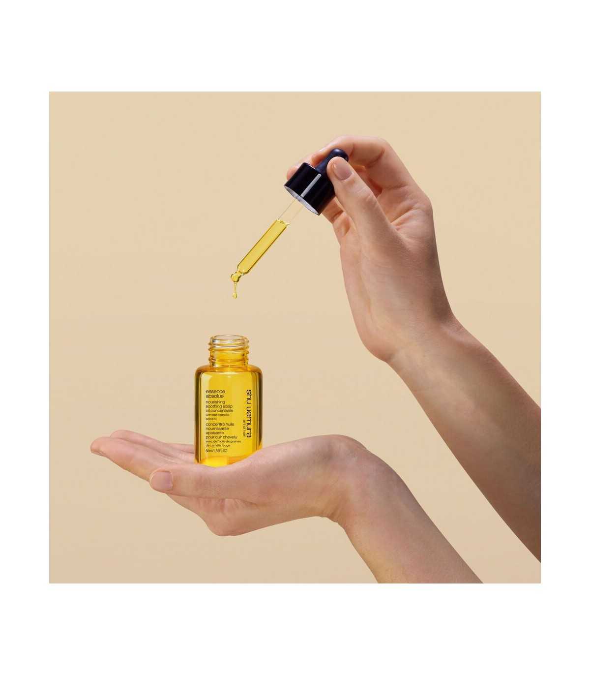 Essence Absolue Nourishing Scalp Oil Concentrate de Shu Uemura es un aceite concentrado nutritivo y calmante para el cuero cabelludo y la longitud. Reduce la sequedad y las molestias, suaviza el cabello, alisa la cutícula e imparte brillo sin apelmazarlo. Aumenta la elasticidad, reduce la rotura y el encrespamiento. Adecuado para cabellos secos y sensibles, puede utilizarse como tratamiento sin aclarado o antes del lavado.